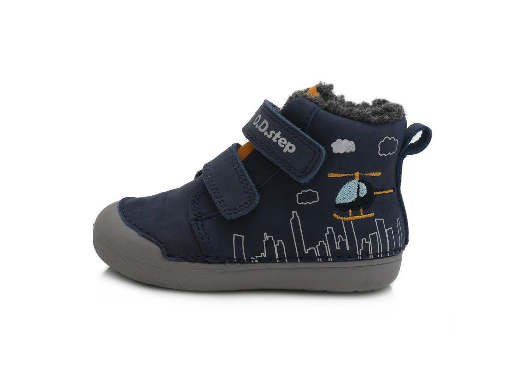 Dětské zimní boty DD Step 066-806B Royal Blue v tmavě modré barvě s obrázkem helikoptéry. Měkké a ohebné kožené zimní boty zateplené kožíškem v celém vnitřku, včetně stélky.Vhodné pro děti se širší nohou příp. i vyšším nártem.
