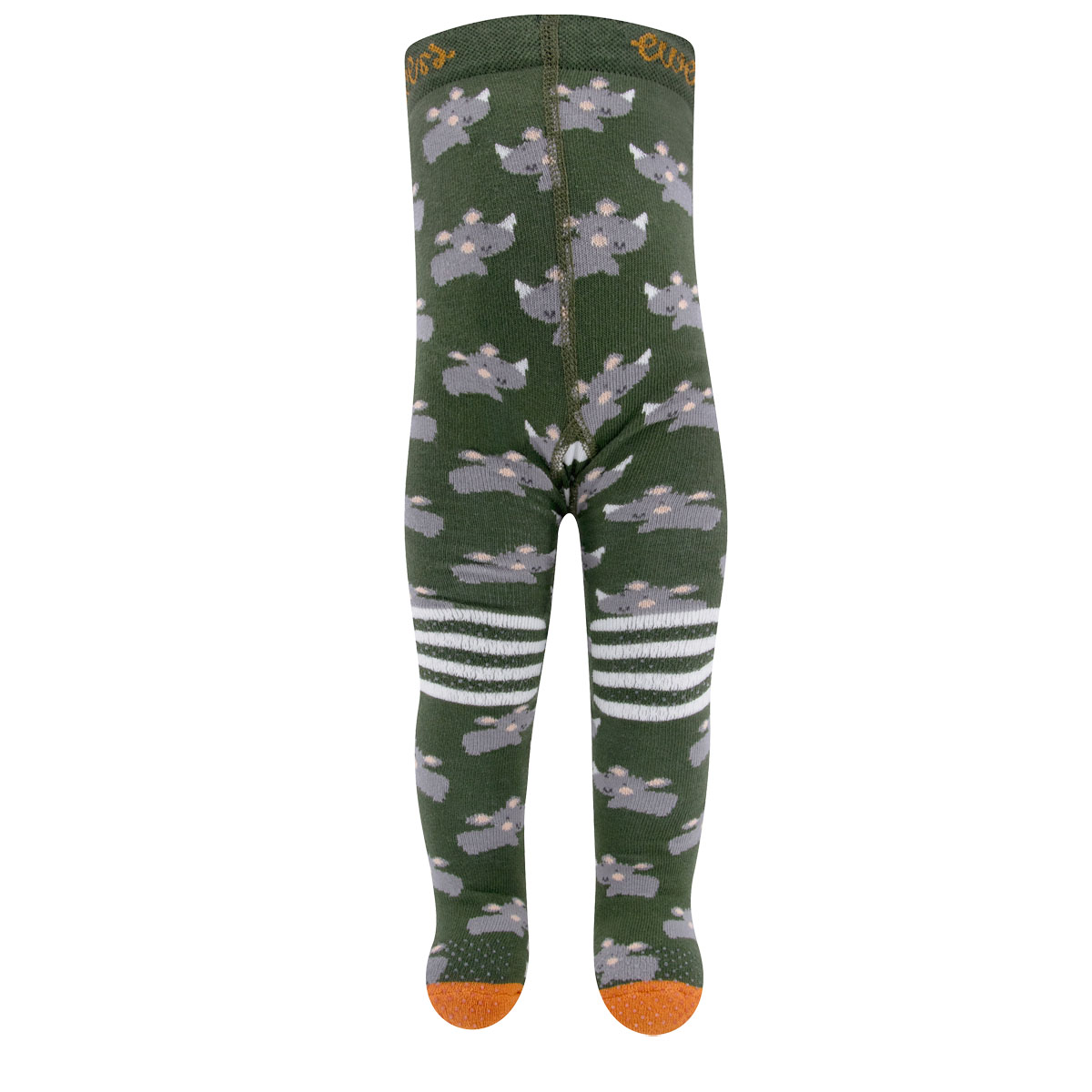 Kvalitní dětské punčocháče v zelené barvě s potiskem nosorožců. Punčocháče mají 3 protiskluzové prvky - na kolenou, chodidlech a nártech, usnadňující chůzi a lezení